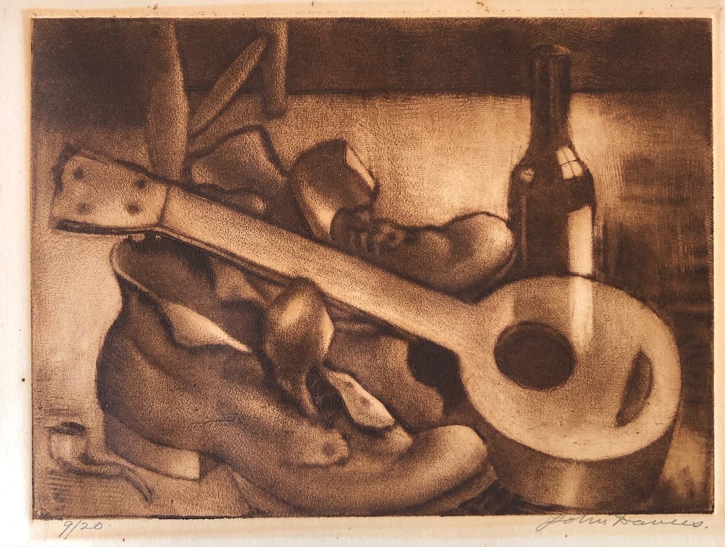 John Davies (American, b. Scotland 1901-1965): “Mandolin” Still-life. Mezzotint in sepia. Edition 9/20. Pencil signed. $495.